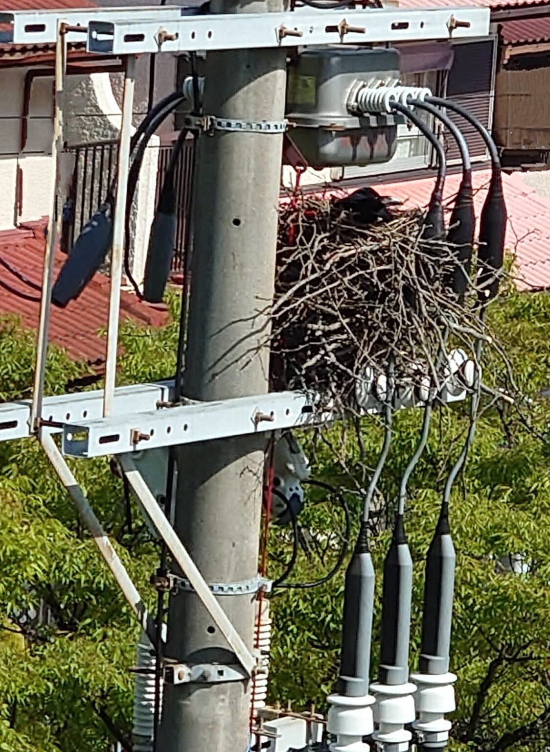 道路上にある電柱の『営巣』であれば、電力会社が撤去しますが、このように小学校の敷地内の電柱は、学校側で処理をしないといけません。